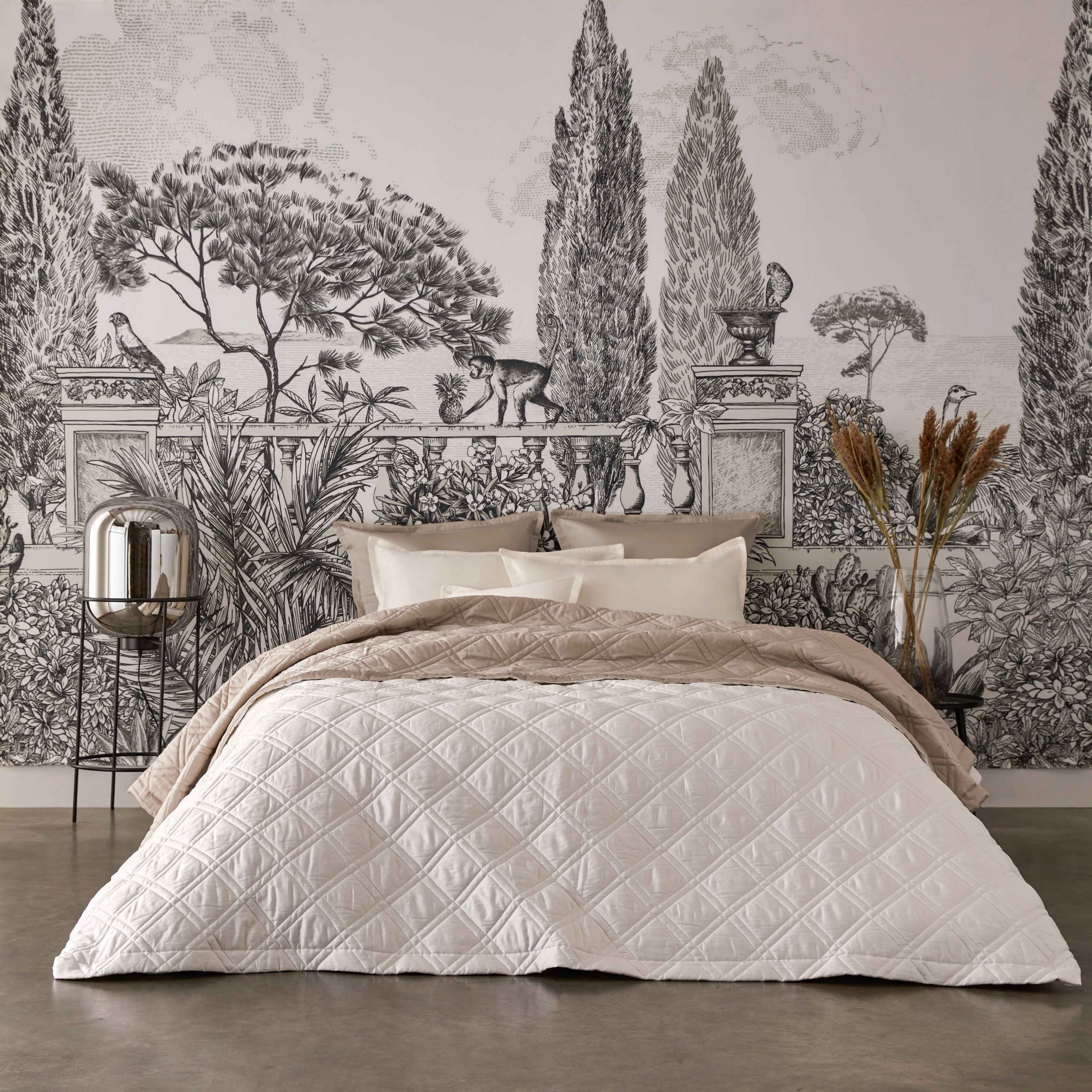 Un couvre lit matelassé bicolore dans un concept durable, en satin de coton Bio et dont la ouate est en polyester recyclé à 80%. Le motif est composé d’un grand carreau d’environ 10x10cm brodé avec un effet double piqûre. Le résultat est une géométrie douce et très couture qui rappelle les matelassages sur cuir des maroquiniers de luxe. Finitions impeccables avec parement de 3cm et coins capuchons pour ce modèle classique chic et couture dont les associations de tons neutres se mixent facilement dans tous les intérieurs. Ses deux côtés unis en font un couvre-lit réversible : variez les plaisirs selon vos envies !