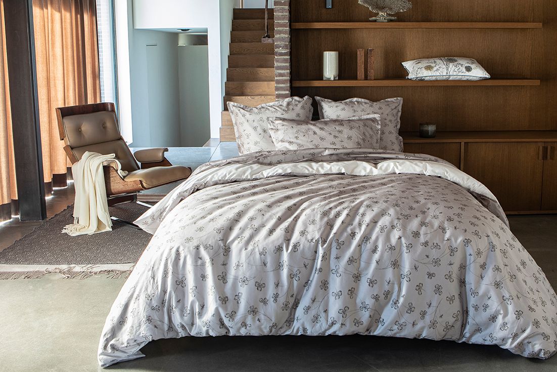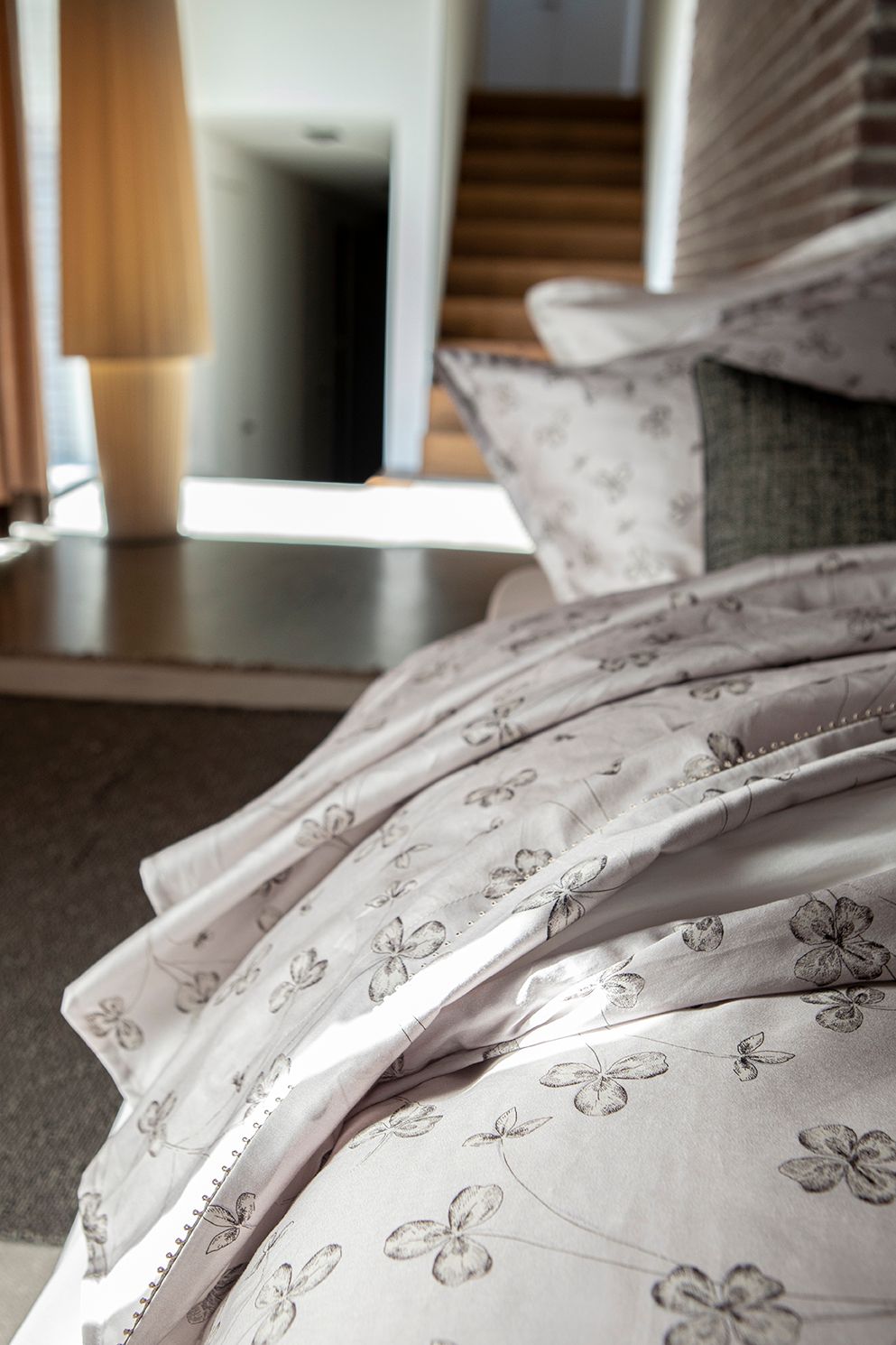 Linge de lit à l’esthétique rafraîchissante et féminine, QUATRE FEUILLES est un modèle à la forte symbolique. Outre son allure, la housse de couette en satin de coton biologique se pare d’une matière naturelle reconnue pour son confort et sa résistance. Un linge certifié GOTS qui garantit une production vertueuse et un toucher des plus doux. Travaillé dans le style emblématique de la marque Alexandre Turpault, le modèle s’habille d’un tourbillon de trèfles. Gracieux et légers, les motifs dessinés à la main viennent ici embellir un fond beige irisé aux airs de nacre. Tout en contraste et en relief, ce décor revêt un look sophistiqué d’une grande neutralité qui est, par ailleurs, mis en lumière par un uni Hermine au dos