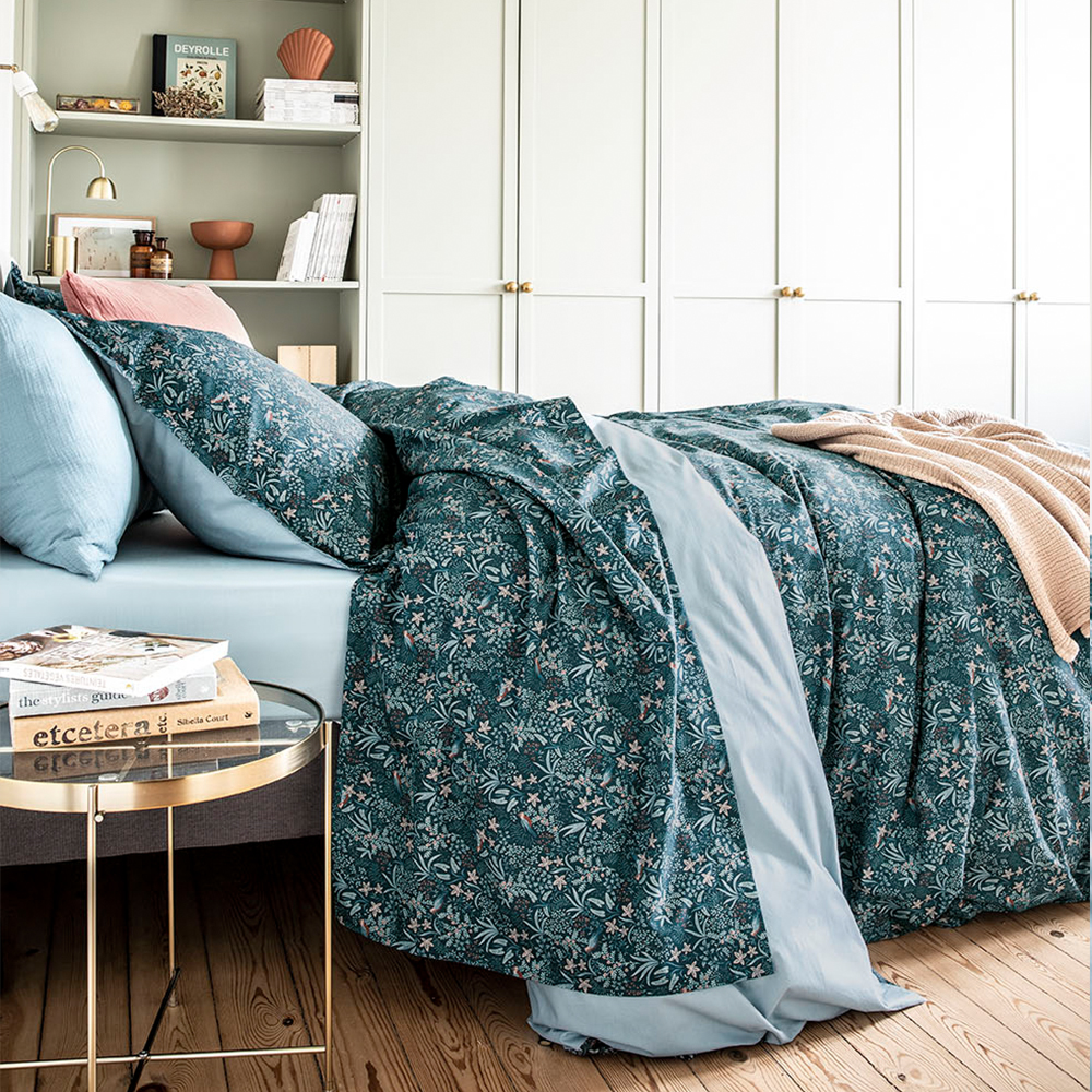 Parure de lit en percale de coton ODE NOCTURNE. Housse de couette et taie(s) d’oreiller 65x65cm. Disponible en 140x200cm, 200x200cm, 240x220cm et 260x240cm.