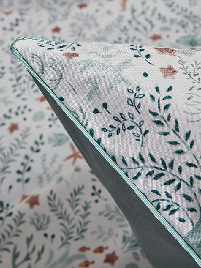 Avec son décor fantastique façon aquarelle et ses teintes vivifiantes, Sous l’océan est le bain de bonne humeur indispensable au réveil. Un paysage merveilleux qui met en lumière la nature aquatique et ravive notre âme d’enfant. Ainsi, ce modèle est une pièce intergénérationnelle qui aura le pouvoir de séduire enfants et parents. Un produit que nous avons souhaité immersif, notamment grâce à un revers uni bleu et un passepoil ruban bleu lagon en contour des taies d’oreiller.
